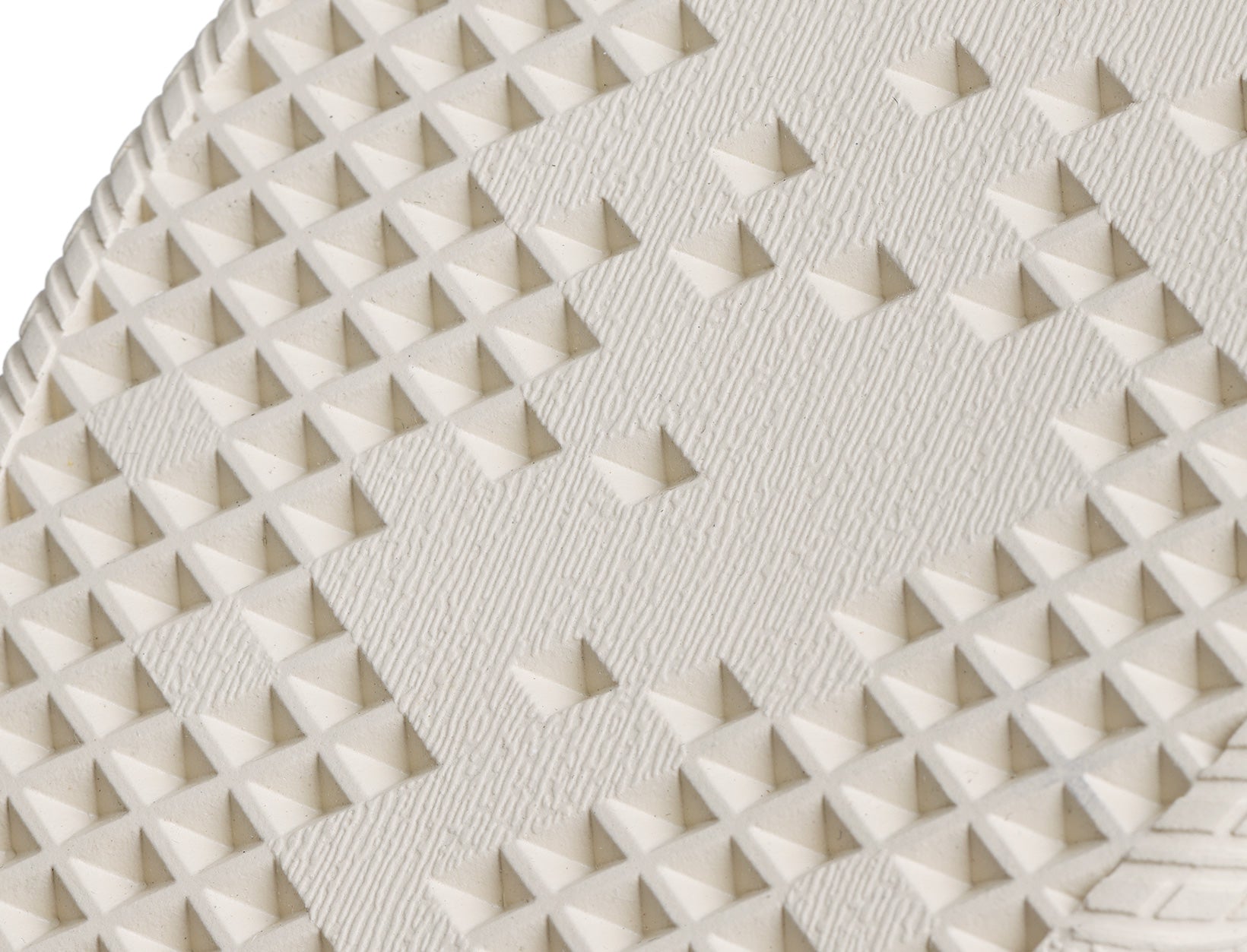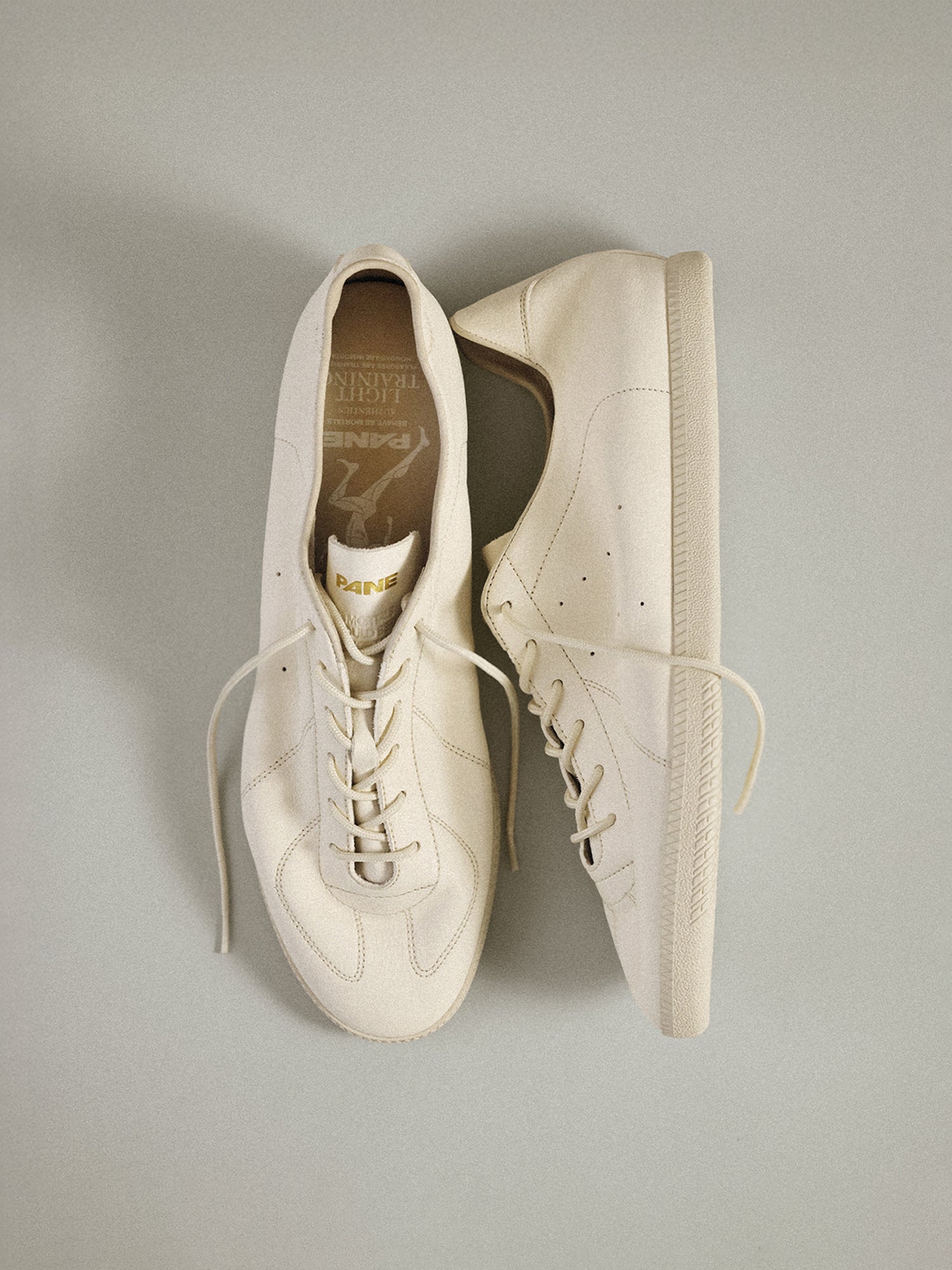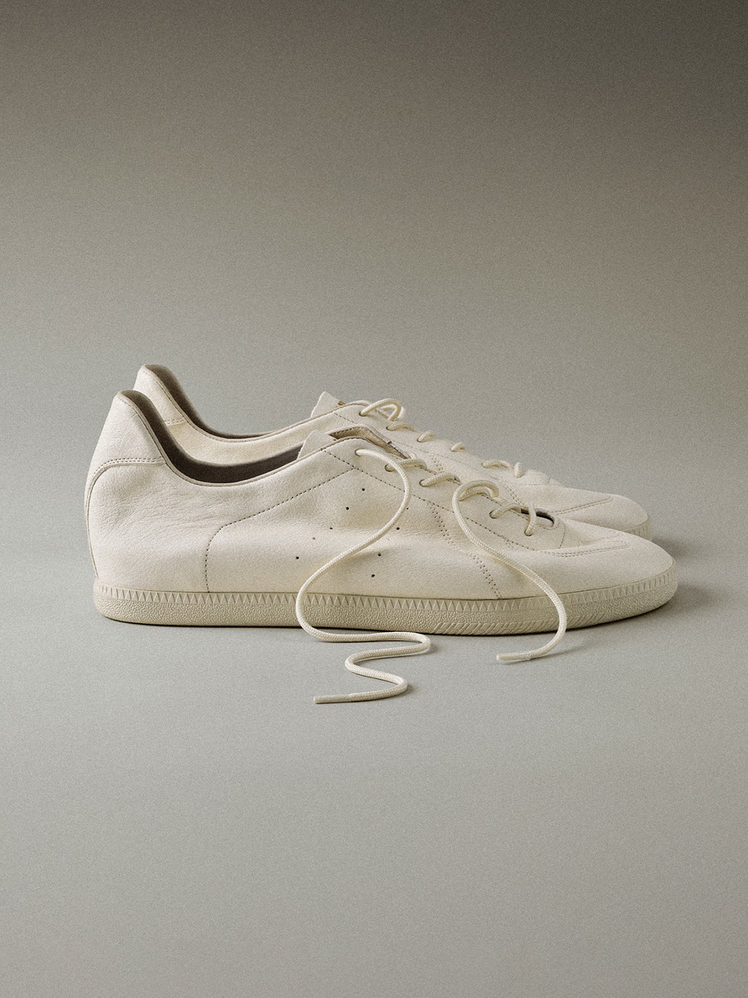 Full-grain leather in pure white with a soft ivory sheen, preserving the natural breathability of leather. Unlined construction offers authentic texture and supple support, wrapping the foot with flexibility. Leather-faced insole combines 5mm Ortholite and 5mm PU insert for stability and comfort. Updated rubber outsole features a longer, tapered profile with vintage-finished tread for a subtly worn-in look. Comes with 3mm white nylon round laces and 4mm white flat laces.