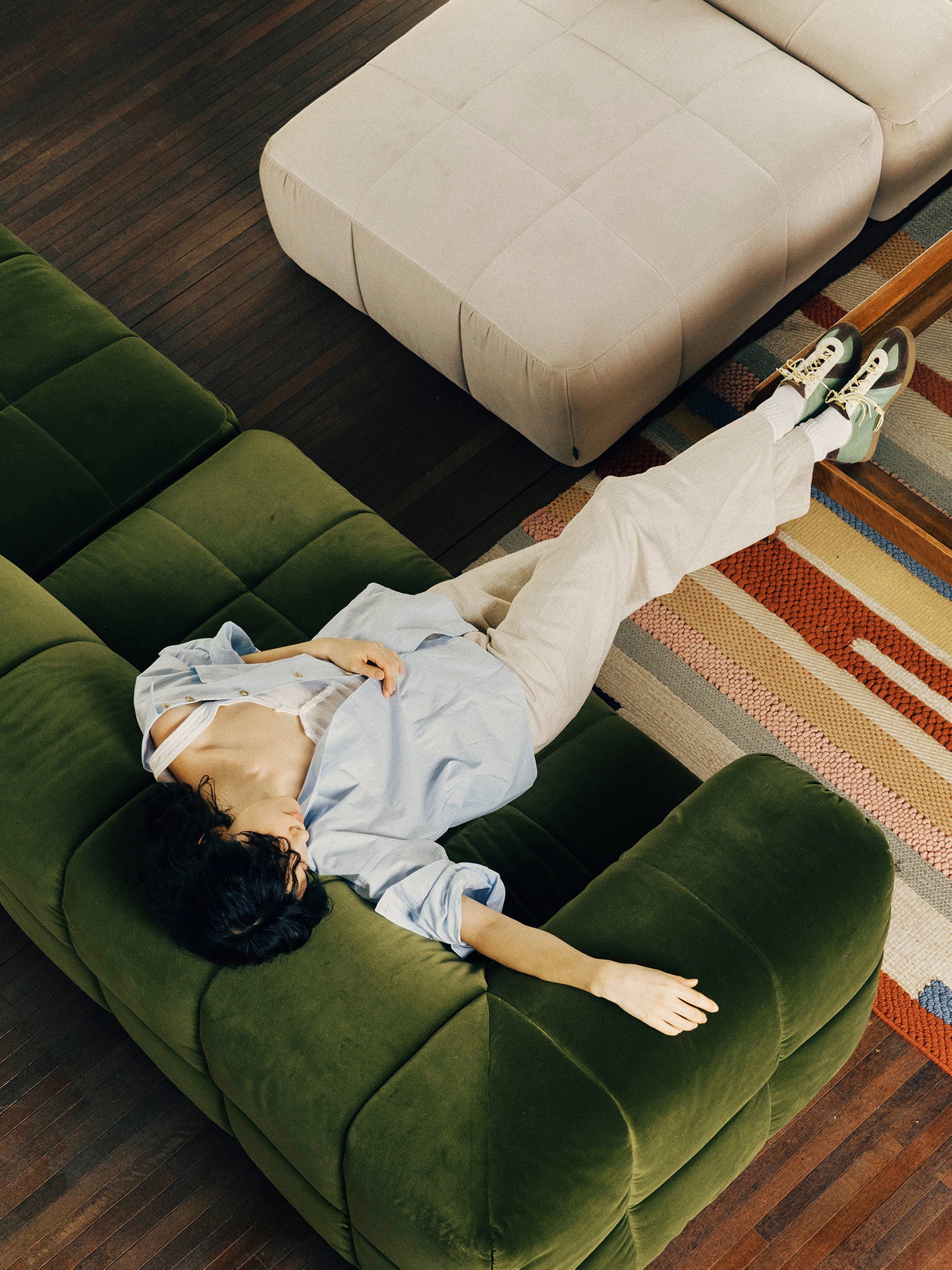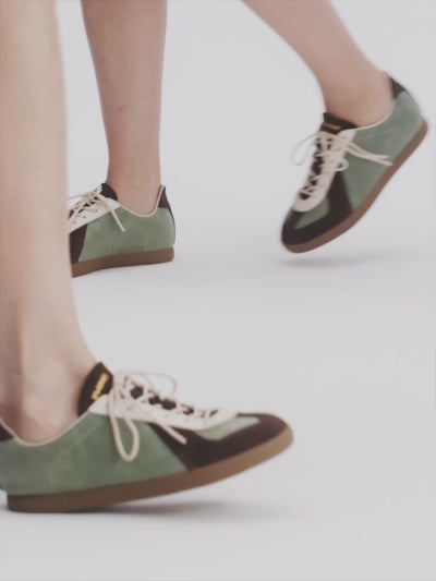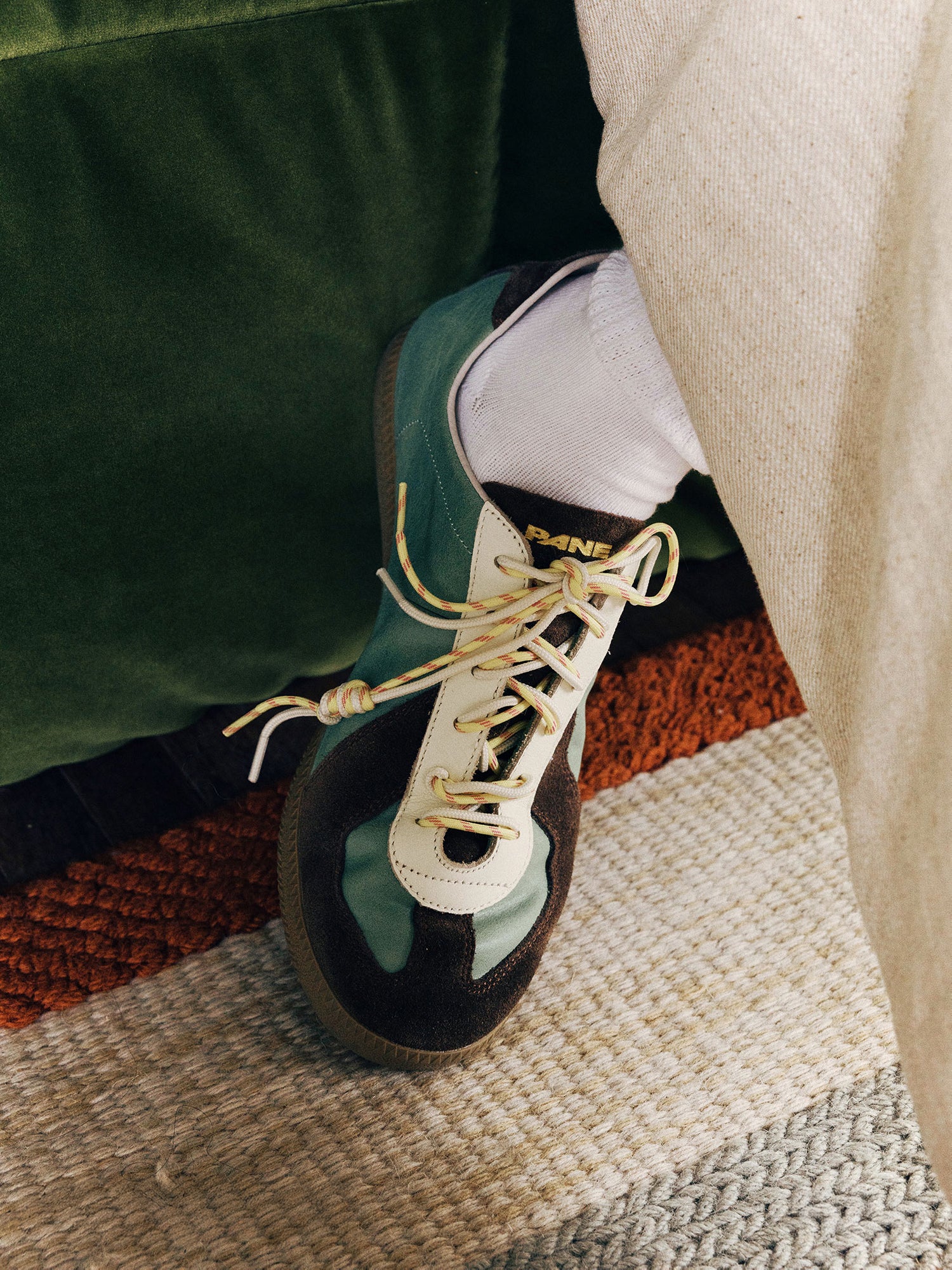 Waxed leather, vegetable-tanned leather, and suede paneling for a refined texture. Half-latex support insole adds stability and comfort, while the vintage-finished outsole lends a retro touch. Comes with off-white nylon round laces and yellow–purple dotted round laces for versatile styling.