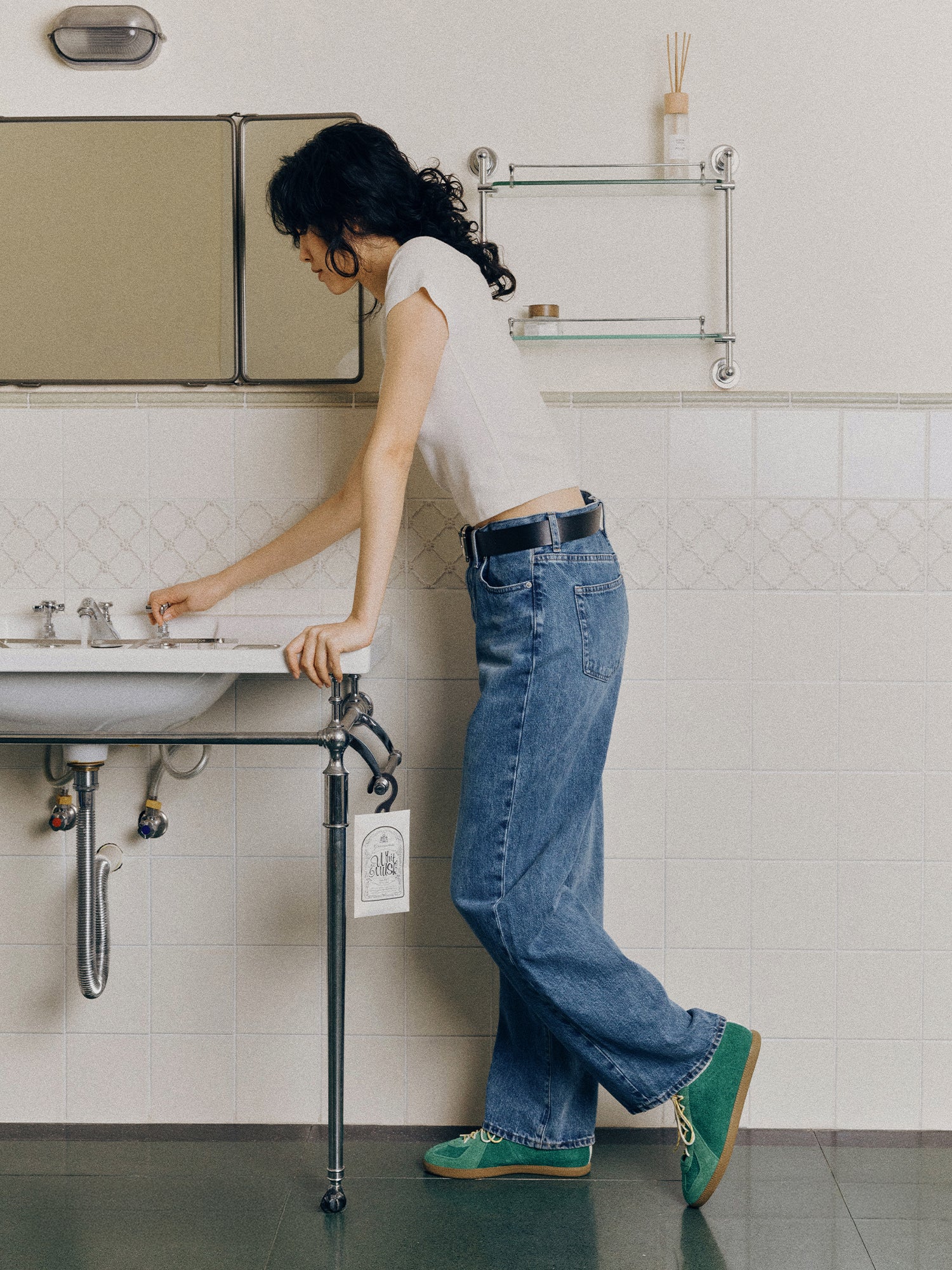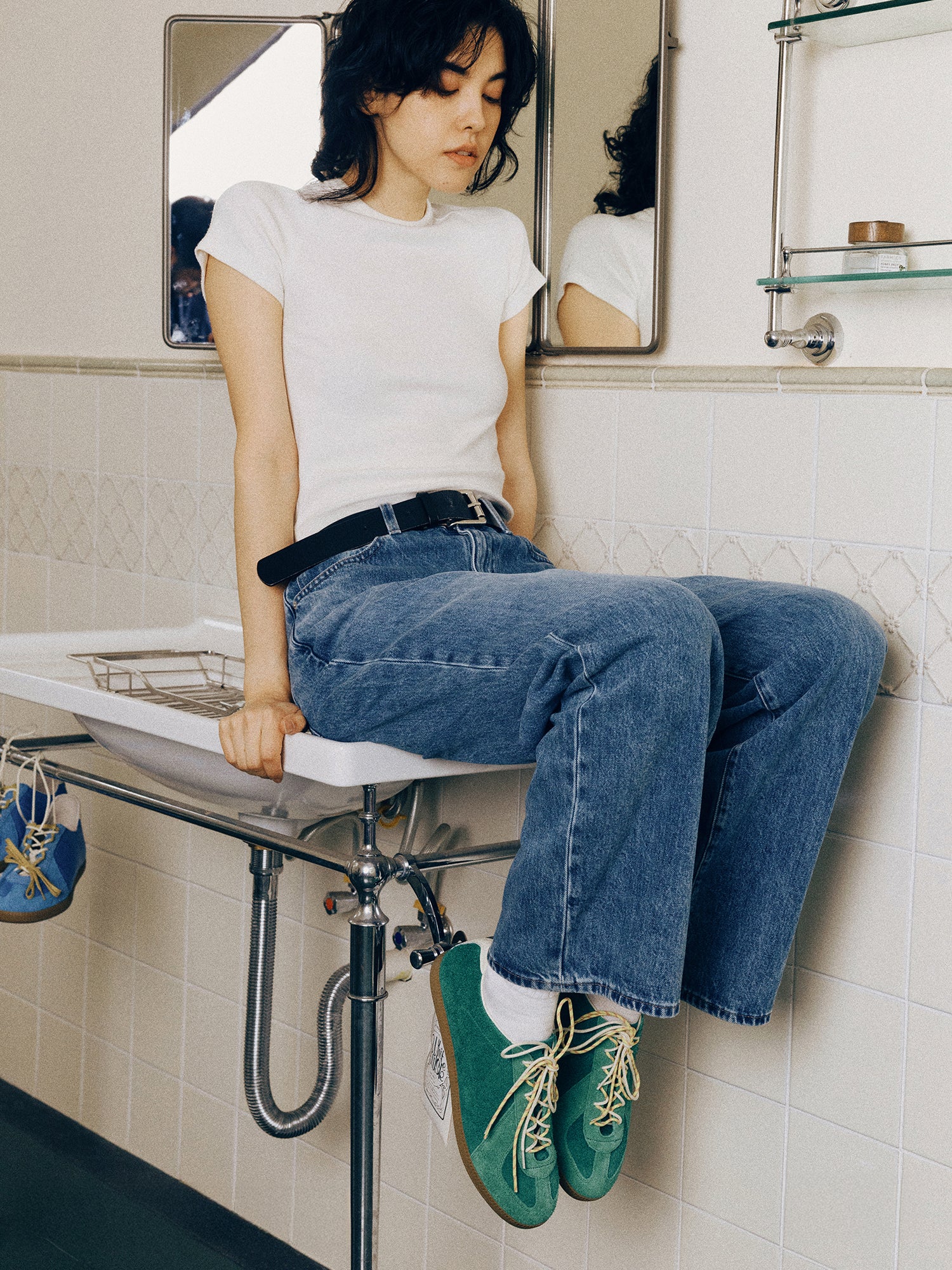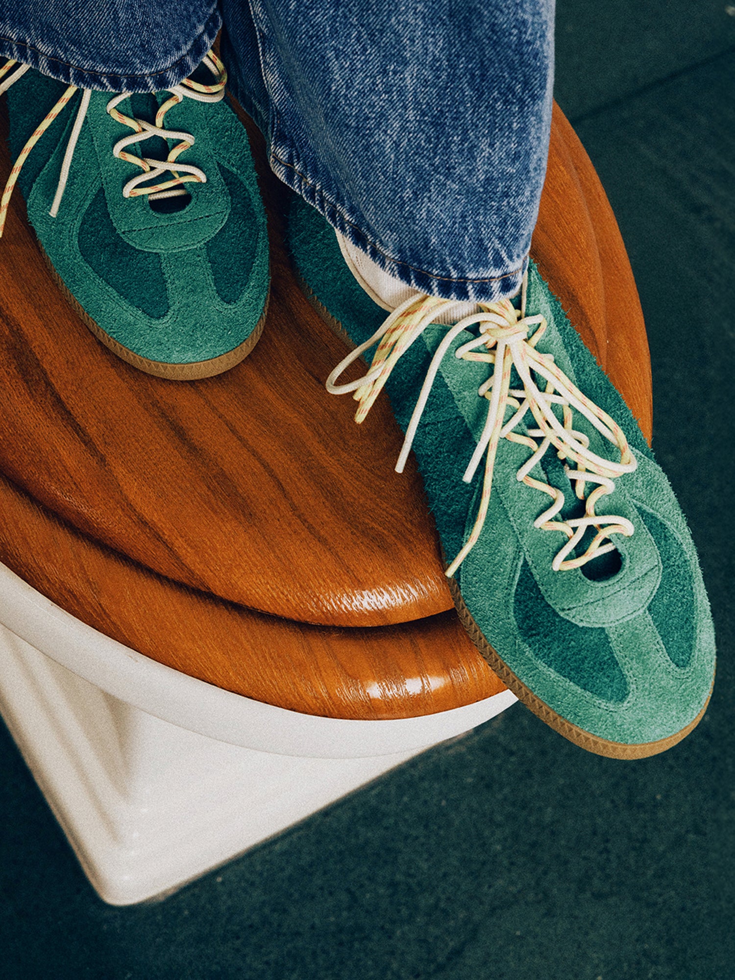 Willow Creek green in waxed leather, smooth suede, vegetable-tanned leather, and split suede paneling for a refined texture. Half-latex support insole adds stability and comfort, complemented by a vintage-finished outsole. Comes with off-white nylon round laces and yellow–purple dotted round laces for versatile styling.