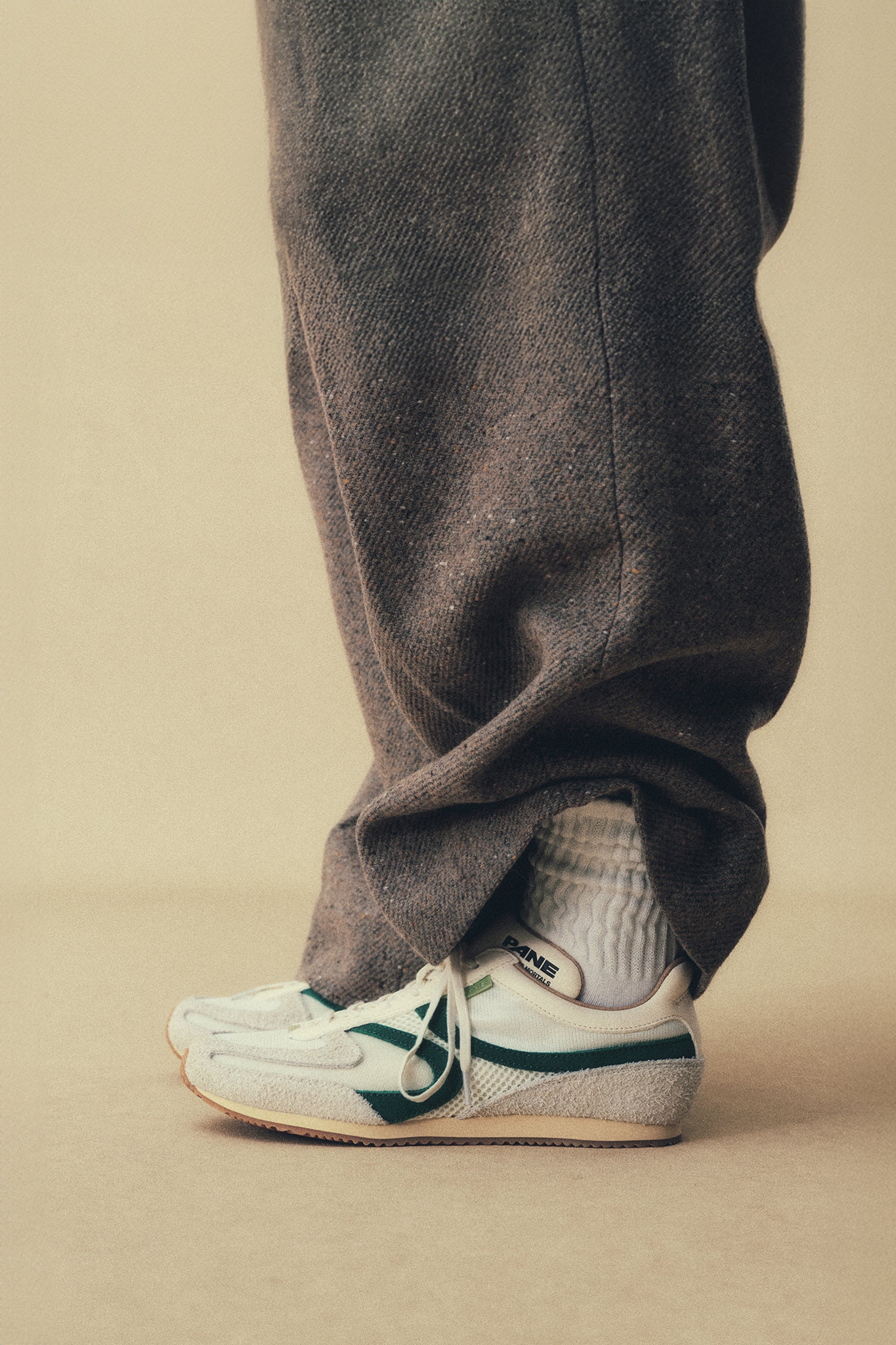 Willow Creek green in waxed leather, smooth suede, vegetable-tanned leather, and split suede paneling for a refined texture. Half-latex support insole adds stability and comfort, complemented by a vintage-finished outsole. Comes with off-white nylon round laces and yellow–purple dotted round laces for versatile styling.