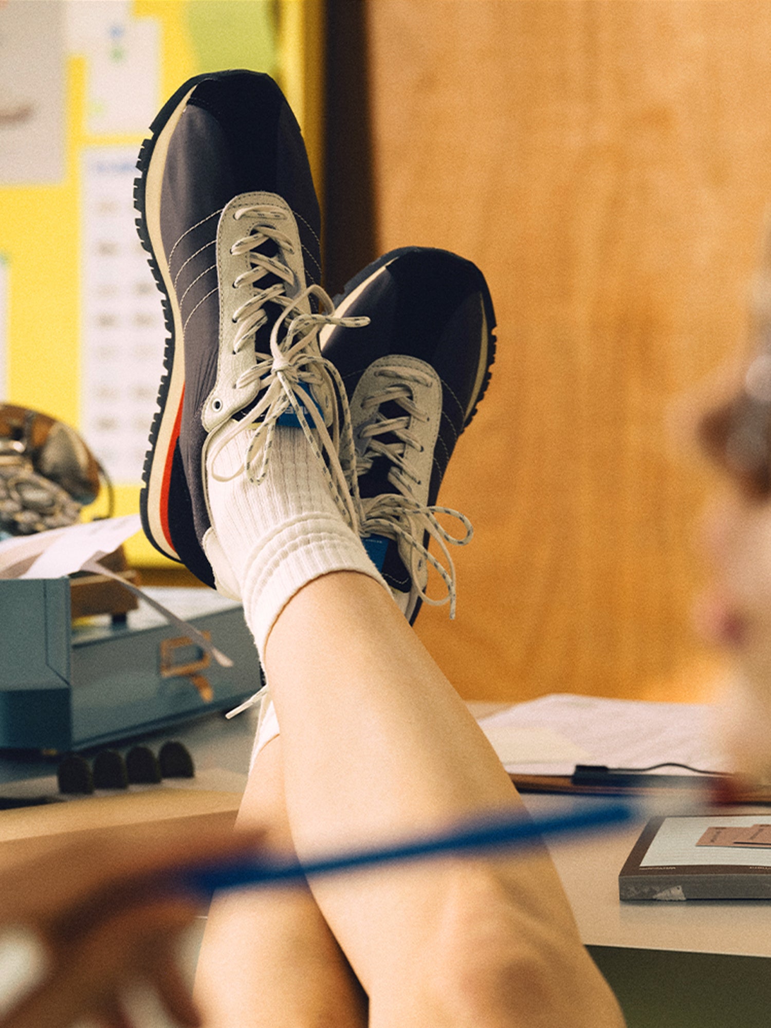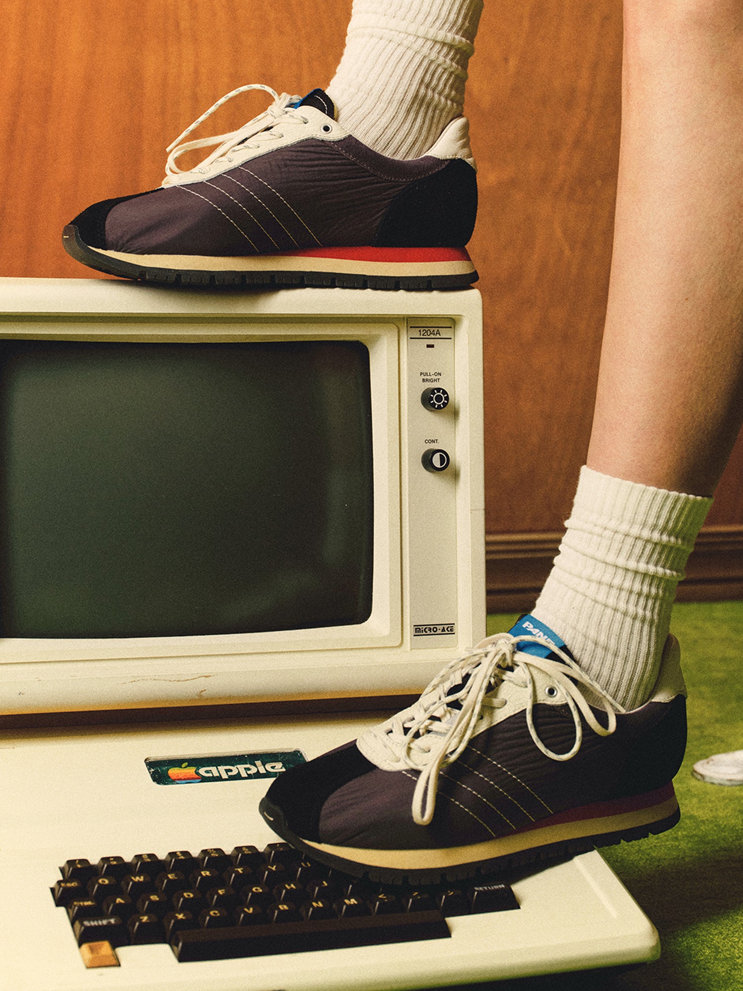 A 1960s-inspired runner silhouette, built with crackled leather and nylon paneling for a vintage-meets-functional feel. The simulated stone-textured outsole grounds the design, while an Ortholite and cork dual midsole provides breathable cushioning. Finished with silver-dotted laces for a subtle accent.