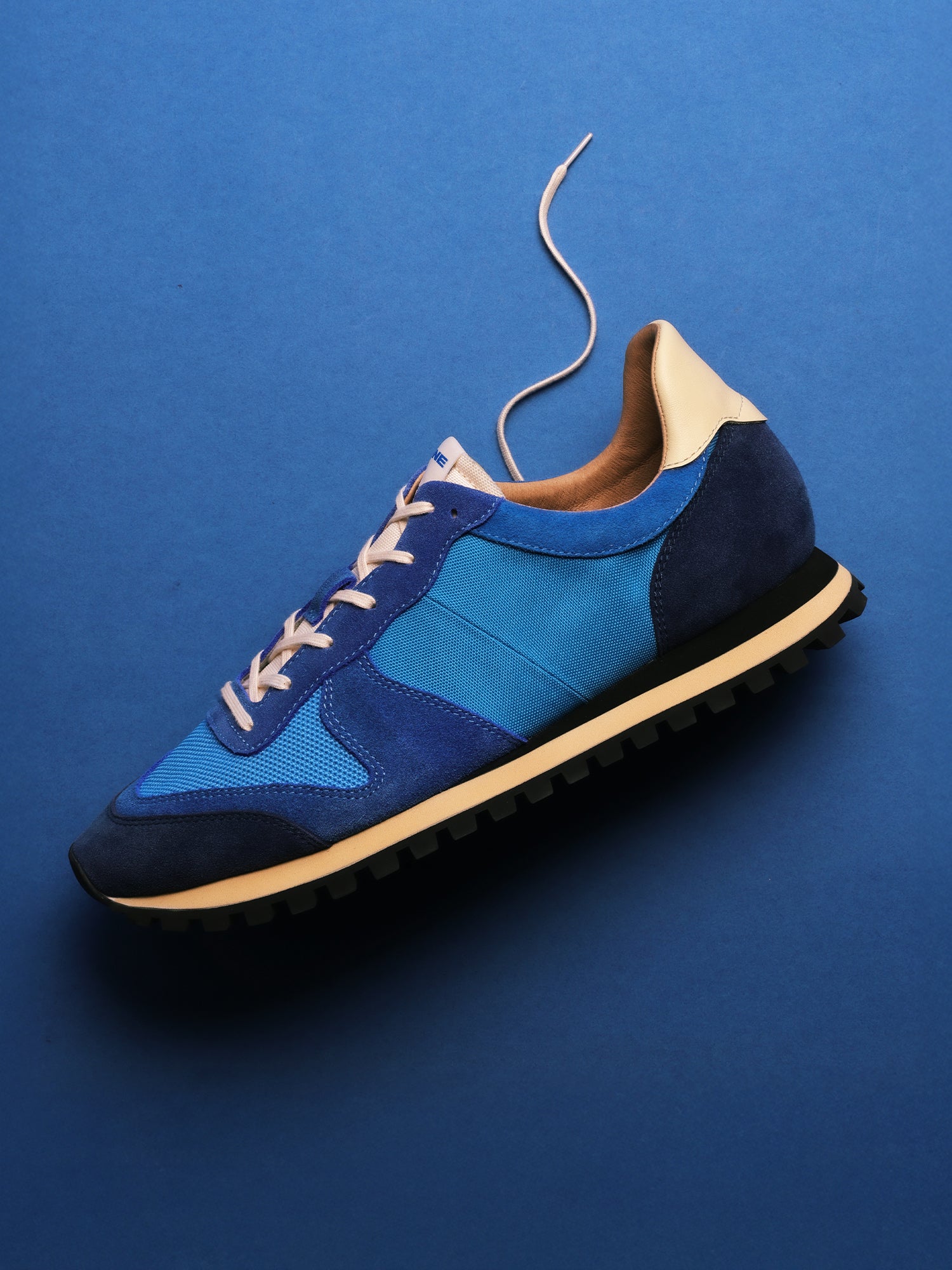 1950s Retro Runner,Designed with a streamlined 1950s-inspired runner silhouette, this style combines washed suede with breathable mesh paneling. A tidal blue gradient finish sets a distinct tone, complemented by an Ortholite moisture-wicking insole and an EVA–cork composite midsole for comfort and durability. The refined arch-contoured shape enhances fit while keeping the profile sleek.