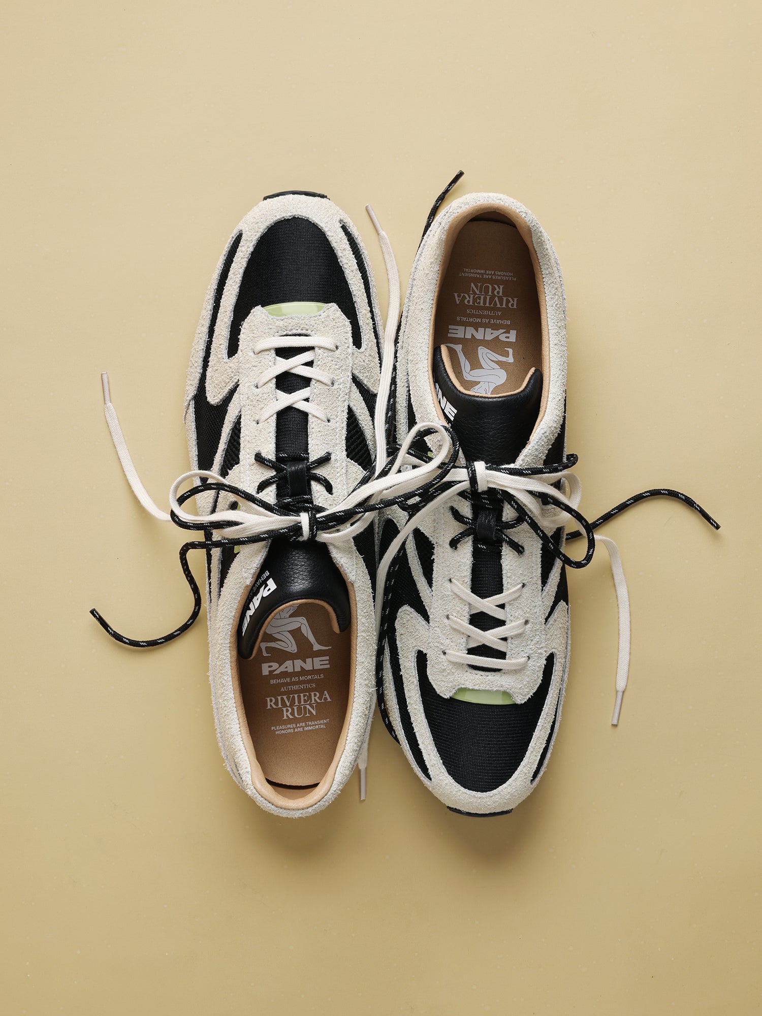Deep ash, with the rugged texture of unpolished stone, intertwines with the minimalist ivory upper—no boundary exists between the white and the gray.Lightweight low-profile design offers ease and comfort, with an elongated, arch-tapered silhouette for an elegant profile.Includes two lace options—off-white cotton (4mm), and black reflective with silver dots (3mm).