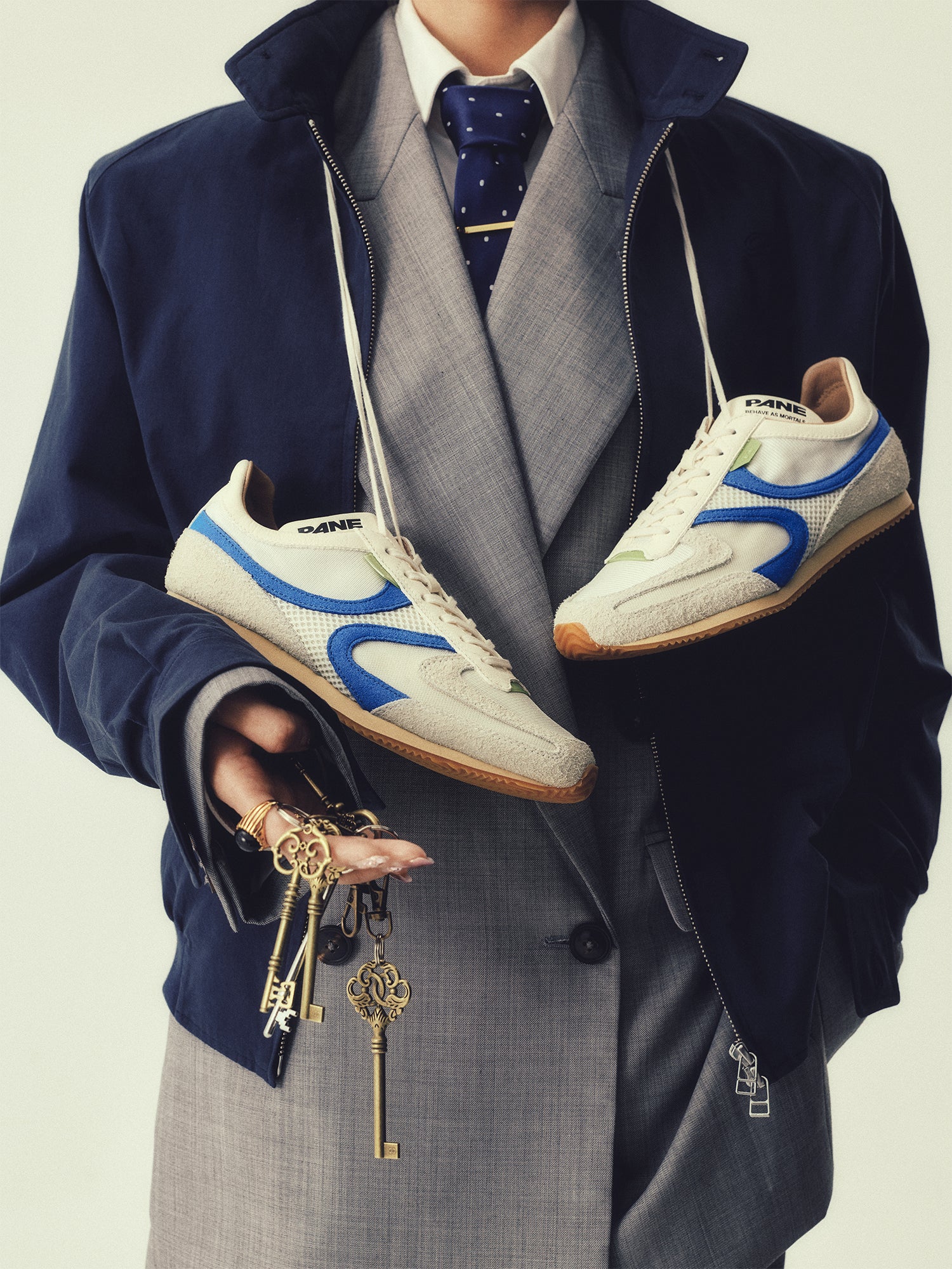 Pale white shoe upper blushed with blue,as clouds clasp the breath of mist,gathering the quiet density of the sky.Nappa leather, suede, glossy nylon, and sandwich mesh combine in a lightweight low-profile design with Canberra material for added breathability. Includes two lace options—off-white cotton (4mm), and Blue Calf Leather-Cotton Flat cotton(4mm).