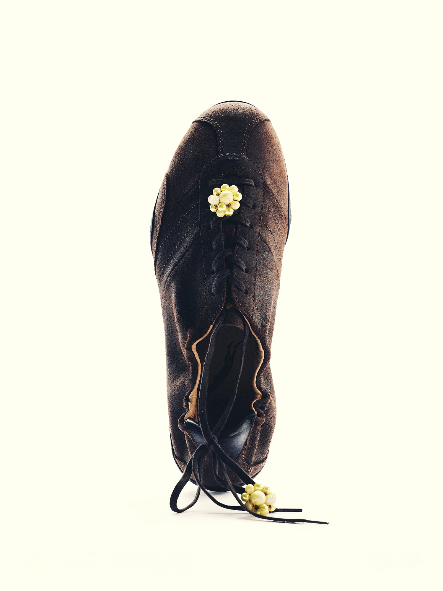 At the collar, the “Pouching” construction introduces a discreet elastic design, creating a gentle, enveloping fit. Delicate gathers add a touch of understated nonchalance, enhancing the shoe’s sophisticated yet relaxed aesthetic.